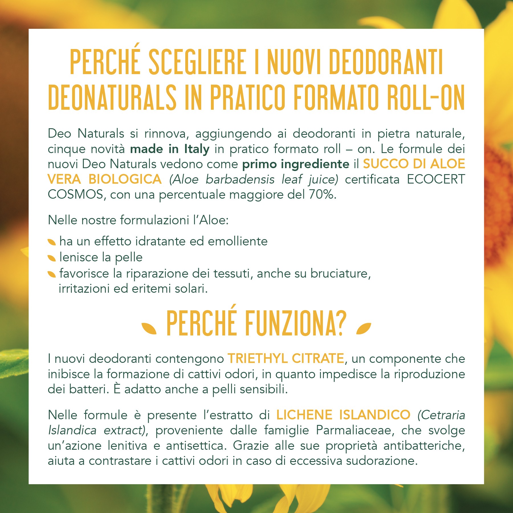 Con succo di aloe vera biologica. Non occlude i pori. Senza Sali di alluminio.